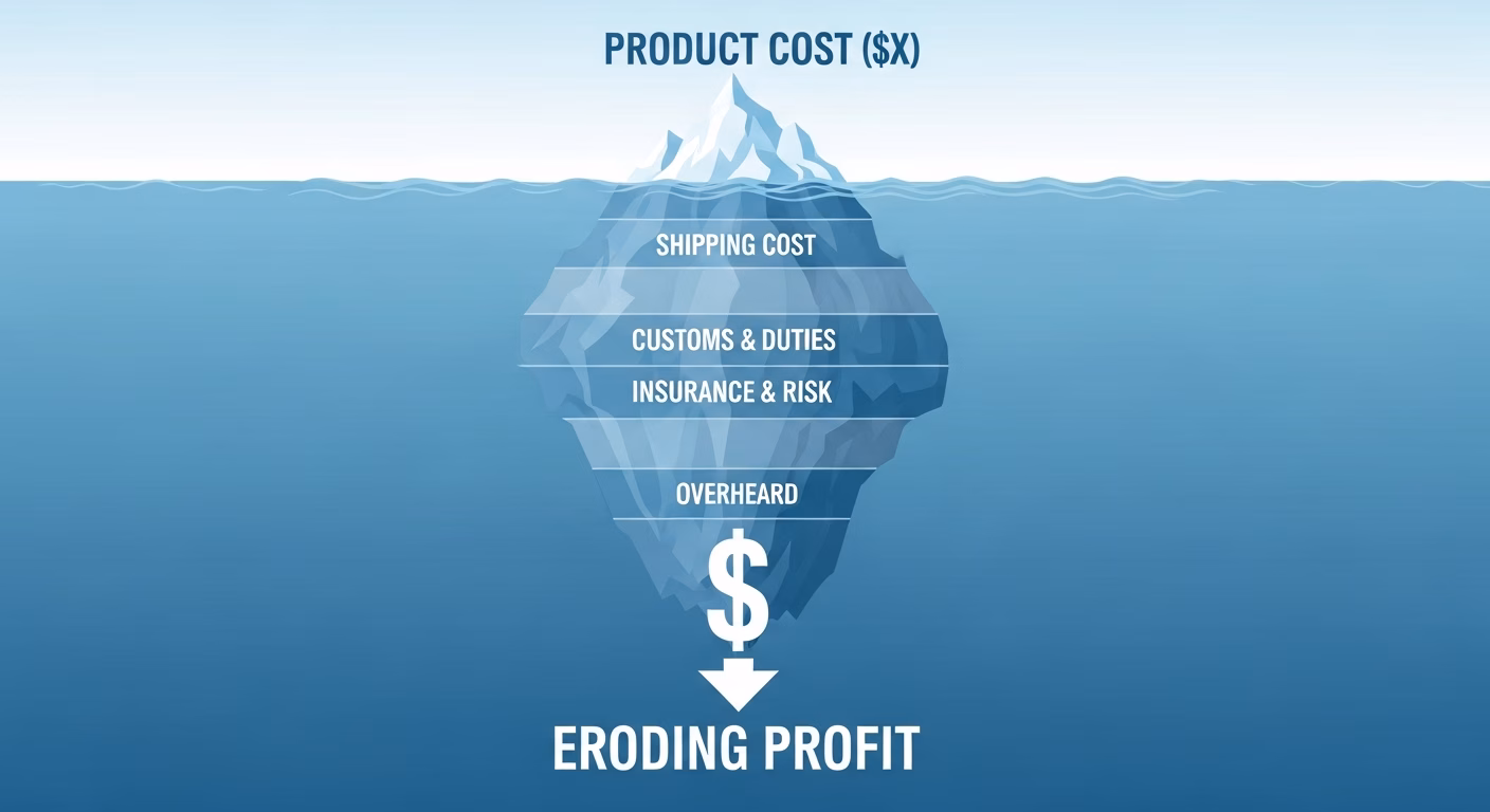 Hãy hình dung Landed Cost như một tảng băng trôi. Giá bạn trả cho nhà cung cấp chỉ là phần nổi. Phần chìm là các chi phí logistics và tuân thủ mà nếu không kiểm soát kỹ, chúng sẽ “đánh chìm” lợi nhuận của bạn.